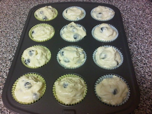 For those who know me, I'm a sugar fiend. I take 7 packets of sugar in my coffee, and I'm probably headed toward a not-so-healthy future of dangerously high glucose levels and, God forbid, diabetes. But I just can't help myself. A couple weeks ago, my sister and I made blueberry muffins courtesy of the Barefoot Contessa, and they turned out moist, tender, fluffy and yummy. Due to popular demand, I went for round 2 of blueberry overload last night, and with my mom's suggestion of amping up the blueberry volume, the second batch was especially juicy. They were a hit even with the saltiest eaters. No wonder Jeffrey loves them.